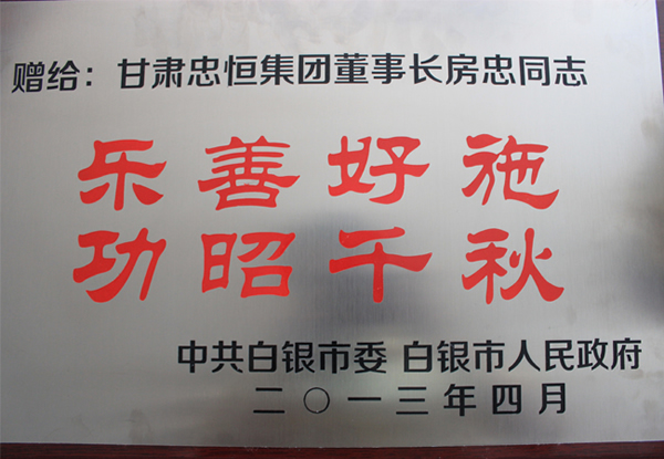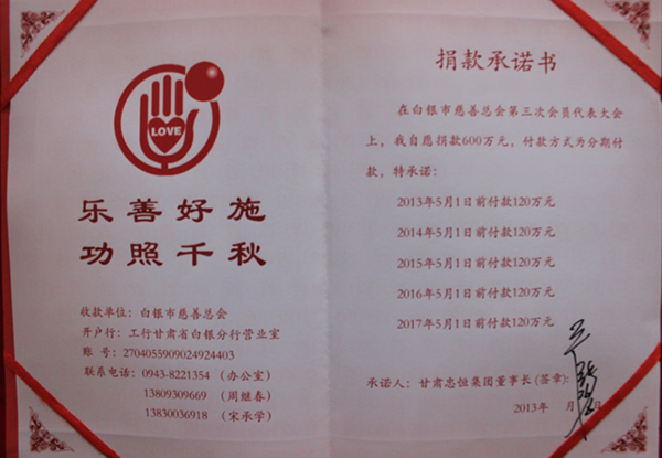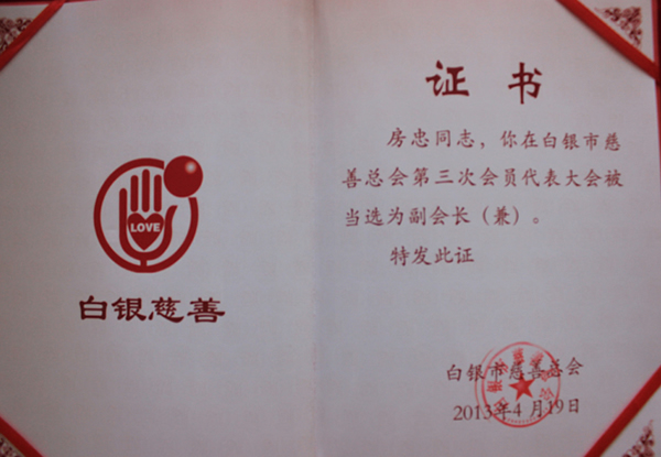 在不久前竣事的白银市第三届慈善总会会员大会上,集团公司董事长再次中选为白银市慈善总会副会长,集团公司财务总监房文昌代表董事长加入了大会,并接受了白银市人民政府市长汪海洲的授牌,在此次会员大会上集团公司董事长允许为慈善总会捐钱600万元,凭证五年时间分期捐钱。
