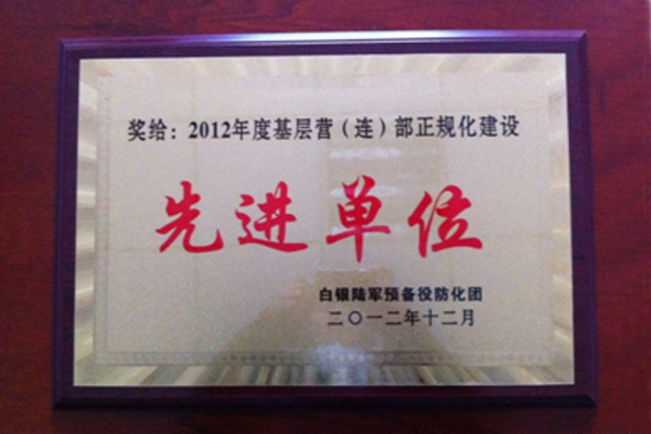 在2013年2月28日上午召开的“白银陆军准备役防化团年度事情聚会”上,由3044am永利集团公司在编的白银陆军准备役防化团三营八连被评为“2012年度下层营(连)部正规化建设先进单位”。白银军分区司令员封庆祝、市委副书记、组织部长、防化团第一政委宋奋吉出席聚会并讲话,聚会由防化团团长催碧宏主持。集团公司党总支书记、防化团三营副营长叶长林加入聚会并领奖。